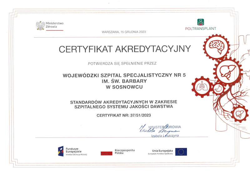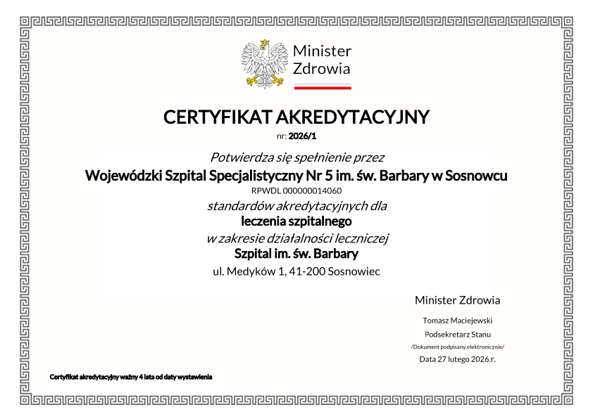 Wojewódzki Szpital Specjalistyczny nr 5 im. św. Barbary w Sosnowcu prowadzi systematyczne działania na rzecz podnoszenia jakości udzielanych świadczeń zdrowotnych oraz zwiększania bezpieczeństwa pacjentów.