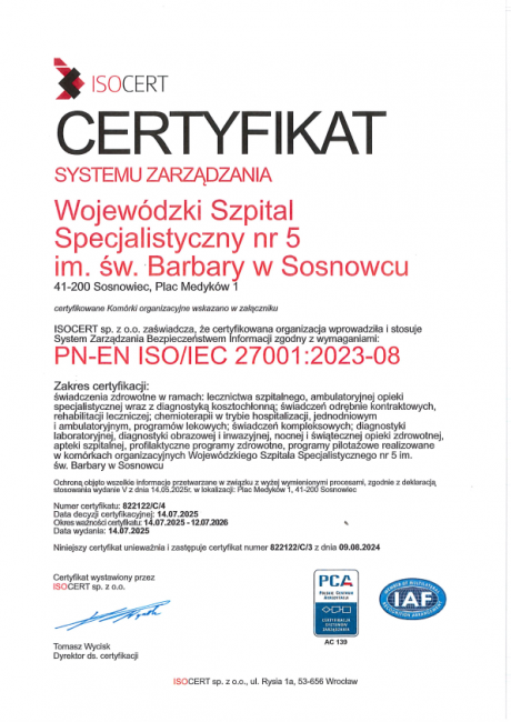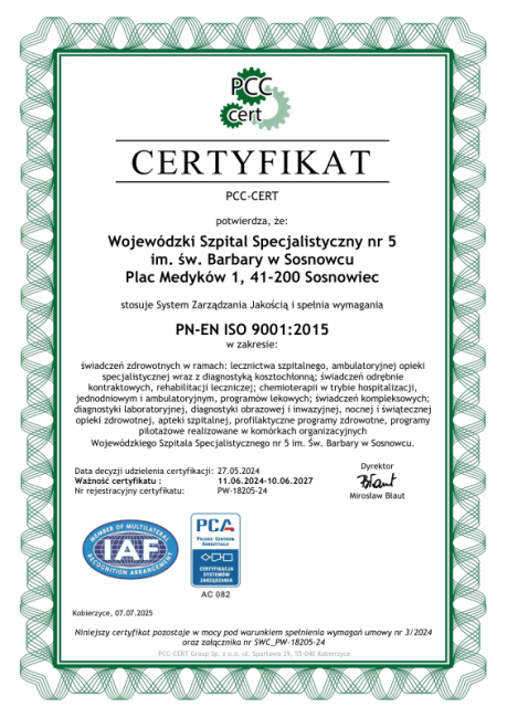 Placówka posiada międzynarodowe certyfikaty: ISO 9001:2015 (system zarządzania jakością) oraz ISO 27001:2023 (system zarządzania bezpieczeństwem informacji, w tym cyberbezpieczeństwem), a także certyfikat akredytacyjny Ministra Zdrowia. Uzyskanie tych certyfikatów potwierdza, że: